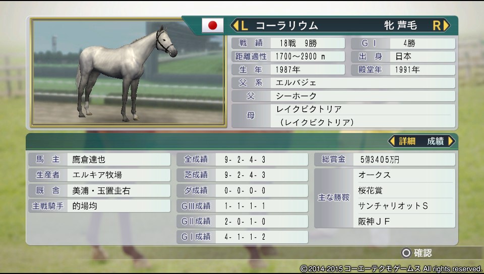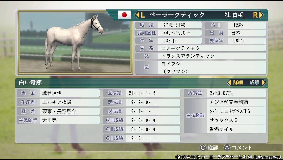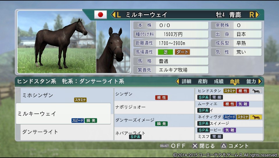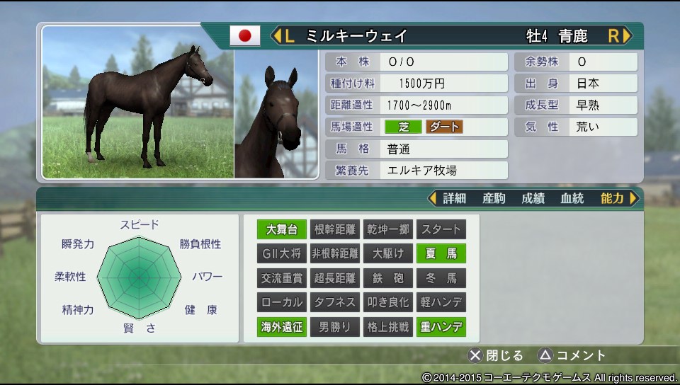 距離適性1700~1900 馬場適正:万能○ 気性:激 成長型晩成(超) 脚部不安(改善)
