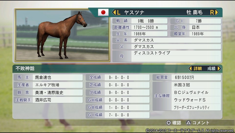 その競争成績は9戦9勝とパーフェクトだったが、米国3冠達成後に衰え始めたようなので1戦だけして銀殿堂にするも、金殿堂は諦めて引退。