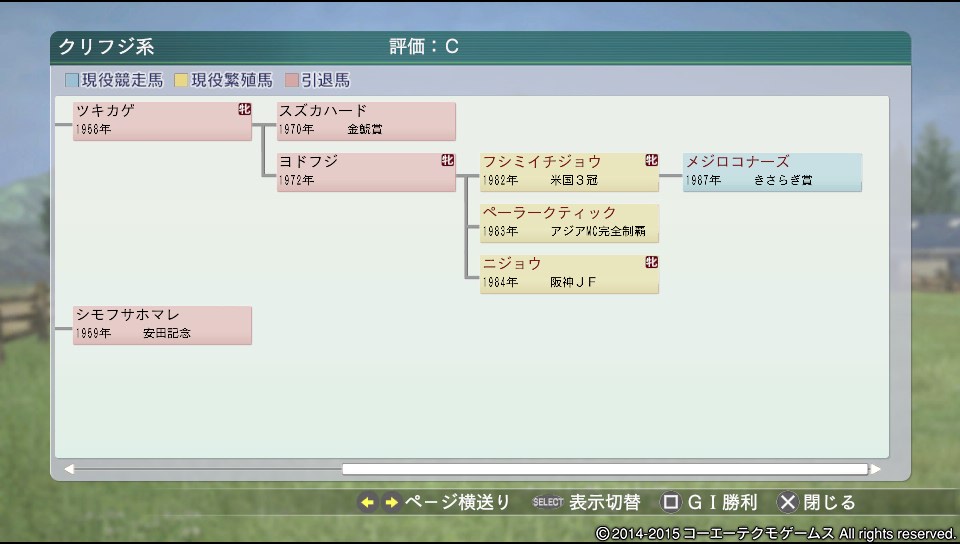 半兄がヤスツナ、半姉がディムユディタと両方ともGⅠ馬。ただしこの馬は河童木の評価が悪いので(成長型にしては)ハンプトン系保護の目的の所有。