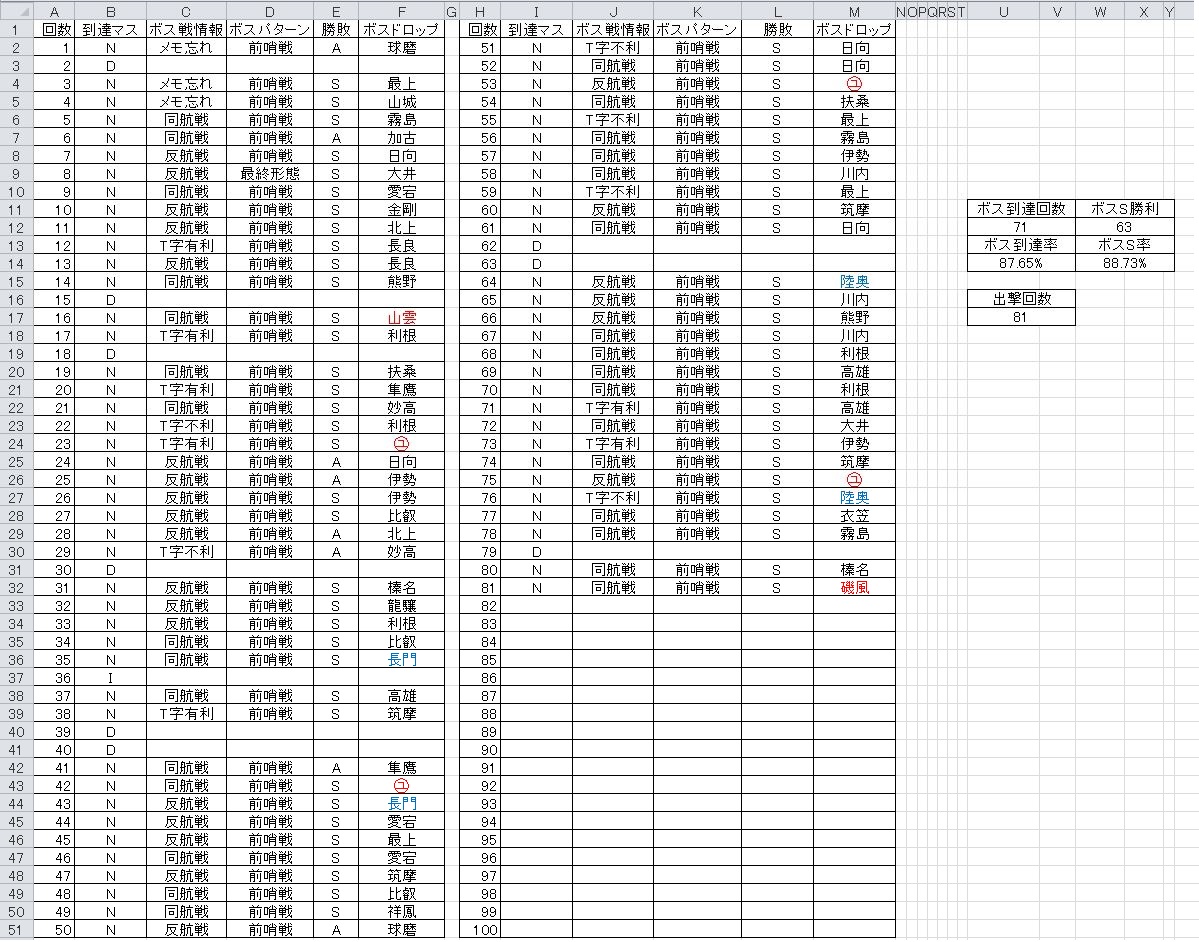 支援艦隊は決戦だけ出し続けてたお陰で結構ボスでS勝利取れた印象かな。1戦目で丁字有利引くと事故りやすいので有利だけは引かないように祈ってた。