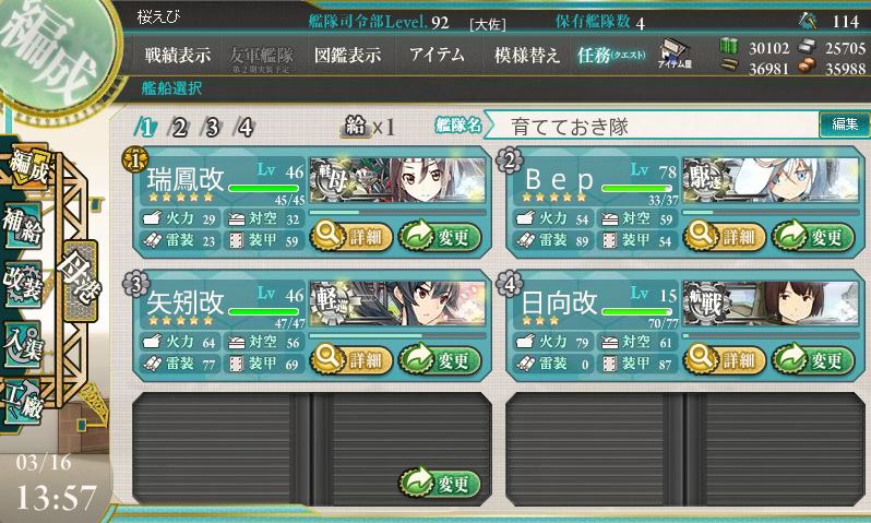 編成はこんな感じですね。航空戦艦育ててないので無茶苦茶レベル低い・・・w